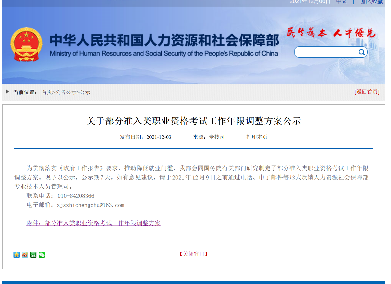 (2021年12月6日)建凱造價部整理發(fā)布《關(guān)于部分準(zhǔn)入類職業(yè)資格考試工作年限調(diào)整方案公示》