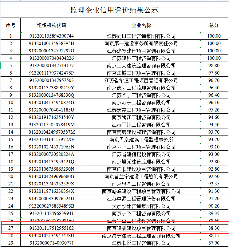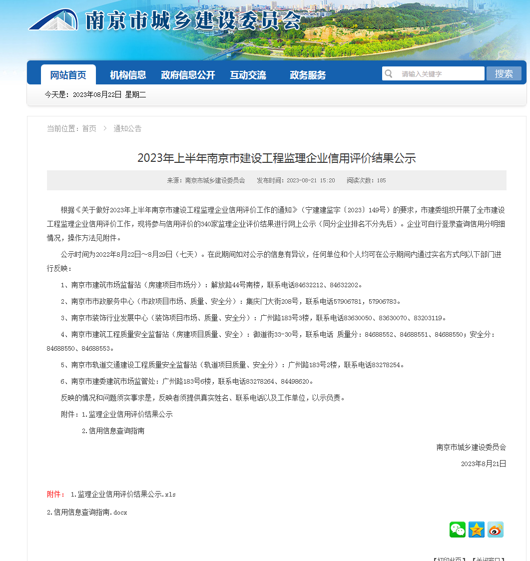 (2023年8月21日)市建委《2023年上半年南京市建設工程監(jiān)理企業(yè)信用評價結果公示》