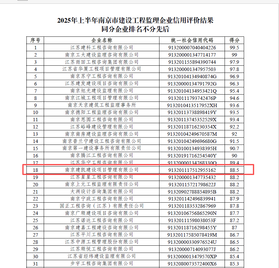 2025年上半年南京市建設(shè)工程監(jiān)理企業(yè)信用評價結(jié)果