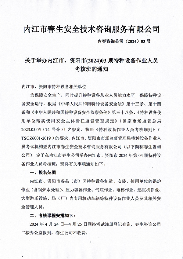 關(guān)于舉辦內(nèi)江市、資陽市(2024)03期特種設(shè)備作業(yè)人員考核班的通