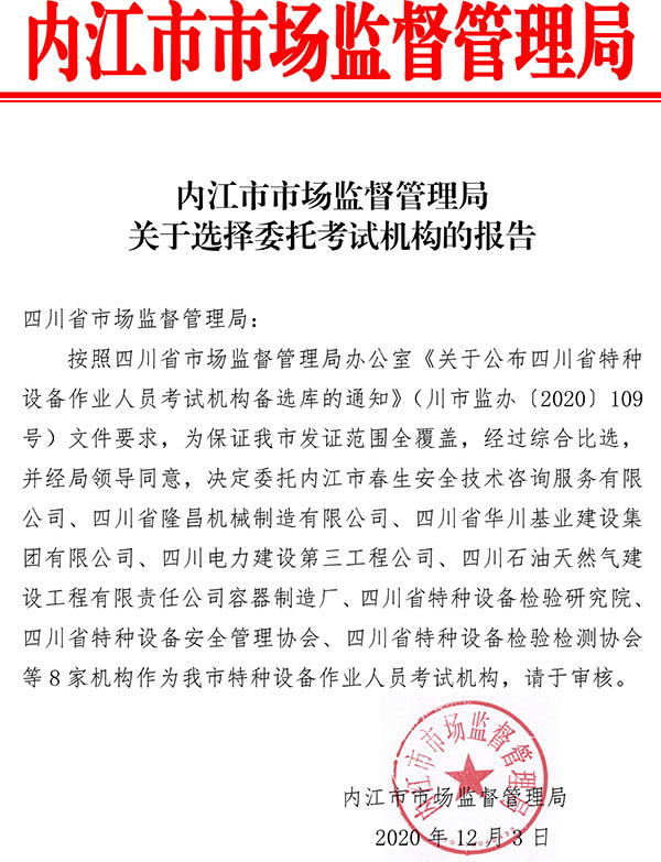 內(nèi)江市市場監(jiān)督管理關(guān)于選擇委托考試機(jī)構(gòu)的報(bào)告